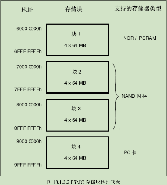 FSMC分为4块,每块256M字节又被划分为4*64,即四个片选