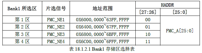 FSMC_A[25:0],而 HADDR[26:27]对 4 个区进行寻址。