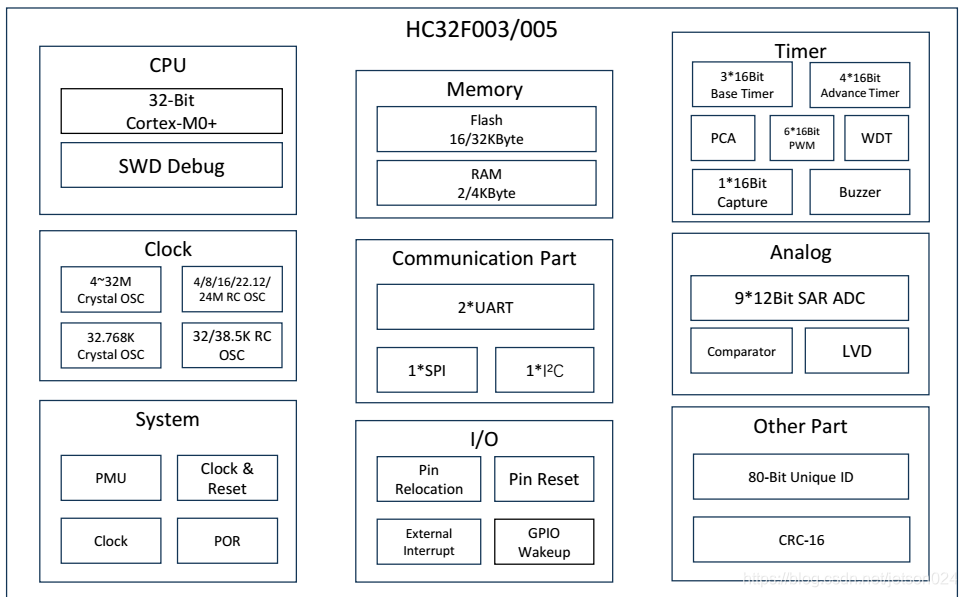 ☆ HC32F003 系列是一款 Low Pin Count、宽电压工作范围的 MCU。集成 12 位 1M sps 高精度SARADC 以及集成了比较器,多路 UART,SPI,I2C 等丰富的通讯外设,具有高整合度、高抗干扰、高可靠性的特点。HC32F003 内核采用 Cortex-M0+ 内核,配合成熟的 Keil μVision 调试开发软件,支持 C 语言及汇编语言,汇编指令。 ☆适用领域:小家电,充电器,重合闸,遥控器,电子烟,燃气报警器,数显表,温控器,记录仪等行业。 ☆ HC32F003/005框图