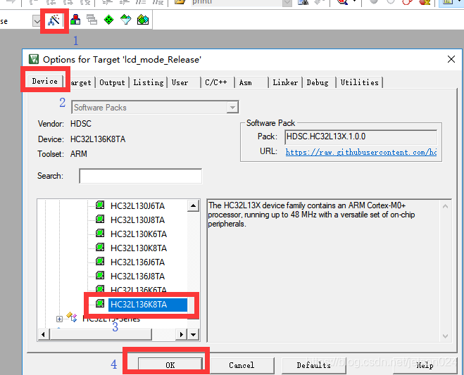 我们以HC32L136的LCD DEMO程序为例来介绍如何进行项目的编译及仿真调试。双击打开\HC32L136_SDK\驱动库及样例\HC32L136_DDL_Rev1.0.0\HC32L136_DDL_Rev1.0.0\example\lcd\lcd_mode\MDK 文件夹下的 lcd_mode.uvprojx 工程文件。在工程中点击魔法棒,选中Device选项,在其中选中HC32L136C4PA。如下图所示。