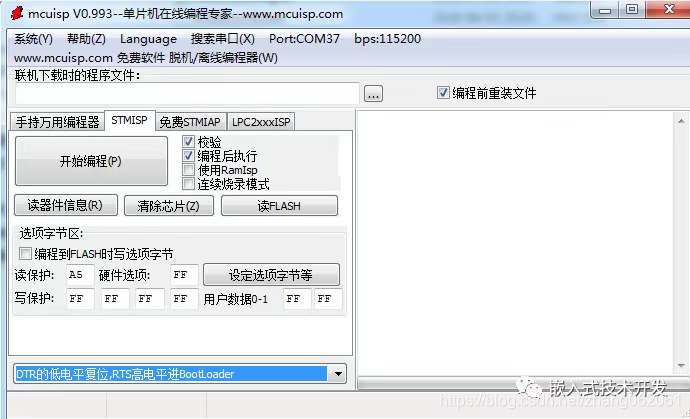 电路比较简单就不详细分析了。程序升级需要配合专用的软件MCUISP。升级时MCUISP软件会控制DTR引脚和RTS引脚将BOOT0引脚拉高,并实现单片机复位,从而进入系统Bootloader。之后可以通过USB转串口对程序进行升级。