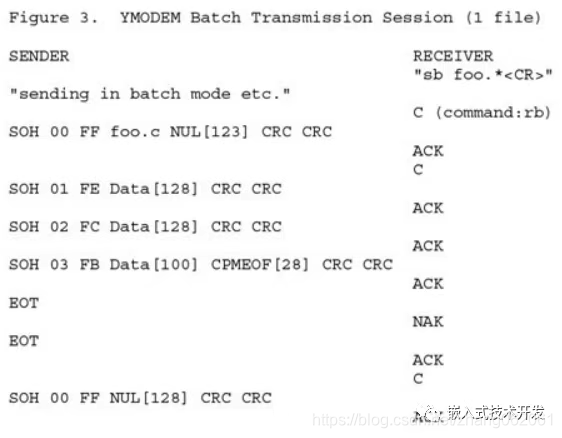 YModem协议是一个非常高效的文件传输协议,每包数据可以达到1024字节。YModem协议传输的完整的握手过程如下。这里就不进行详细介绍了,用户也可以采用自定义的协议,协议设计要主要发送、反馈和校验,保证传输数据的正确性。