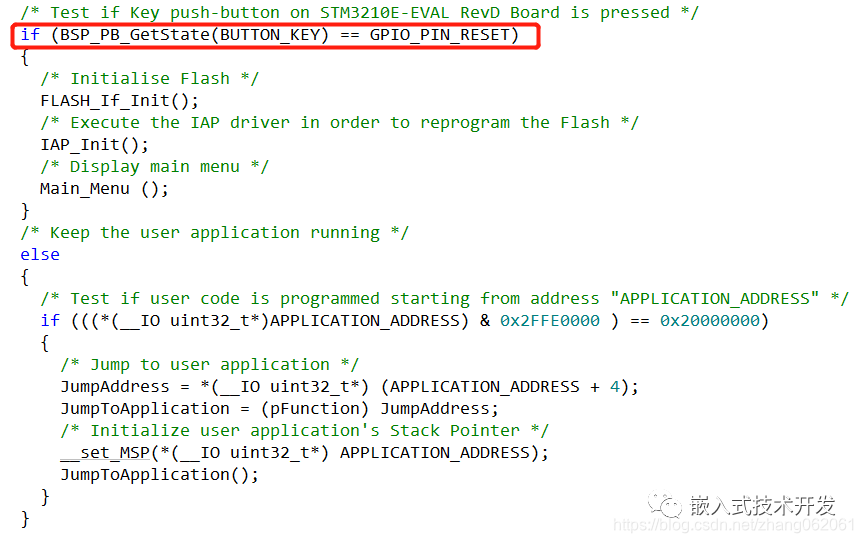 可以看到,程序初始化后通过检测按键来判断是否需要升级应用程序。