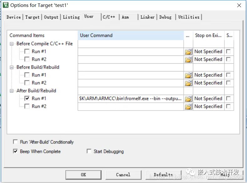 最后,MDK默认只生成HEX文件,要生成bin文件需要添加一条指令。在User选项卡中,勾选 “Run # 1”,在后面输入框写入bin文件生成方式: