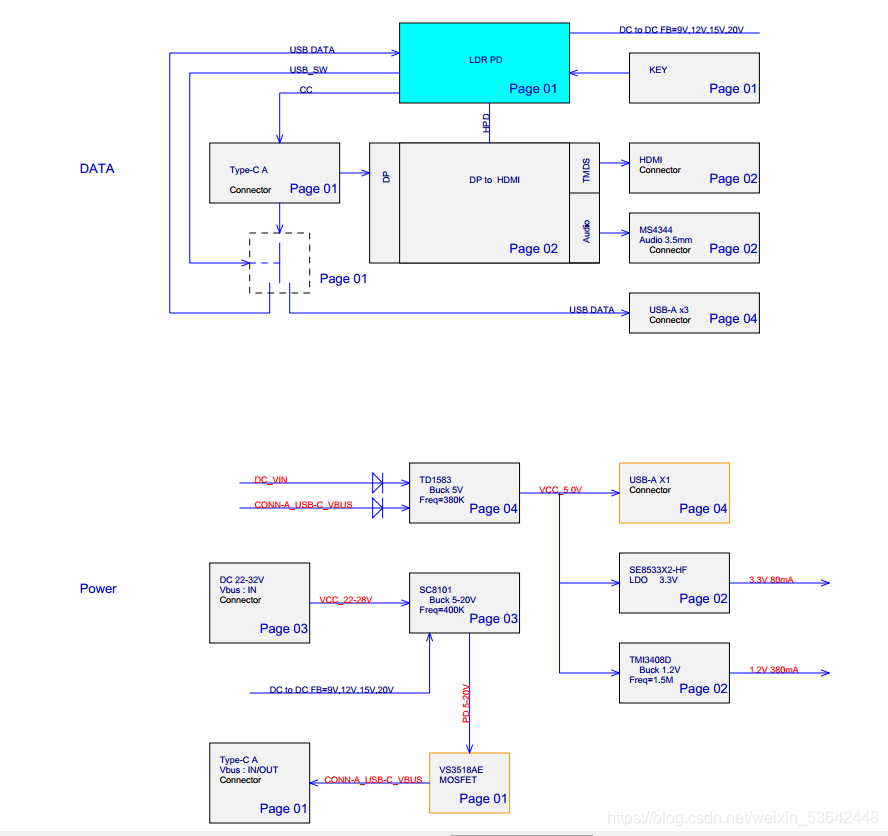 上图分别从Date和Power两个方面阐述了LDR6290的主要框架。首先从Date上面来看,通过与LDR6290 CC PIN的协议通讯,USB Type-C接口输入DP信号与Date信号,给到单USB Type-C接口桌面显示器的相关功能模块,实现音视频显示与USB3.0/2.0的功能。再从Power上面来看,DC接口的22V-32V的电源输入,经过DC-DC芯片,从USB Type-C接口输出5V-9V-12V-15V-20V的电压,当然这个电压输出多少,决定于插入单USB Type-C接口桌面显示器的手机或者显示器跟LDR6290的CC协议通讯,再由LDR6290控制DC-DC芯片的FB产生。