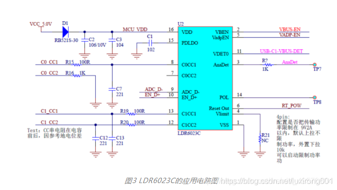 这颗芯片,可以同时与手机和充电器进行pd通信,让手机在充电的同时,进入USB HOST模式(默认情况下,手机充电时为usb device模式),从而顺利的实现边充边听的功能。难能可贵的是,这颗芯片能够同时支持数字耳机和模拟耳机(通过pin3检测),兼容性非常好。下面是这颗芯片的应用电路图: