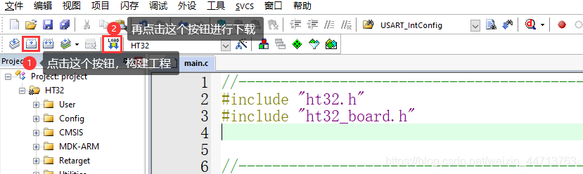 最后进入keil5的编辑界面,按下图步骤即可进行一键下载
