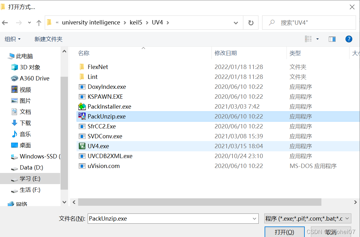 解决办法是在keil5安装路径下找到keil5\UV4\PackUnzip.exe的确定路径,并右键.pack文件选择打开方式中在电脑上查找其他应用,然后再次打开