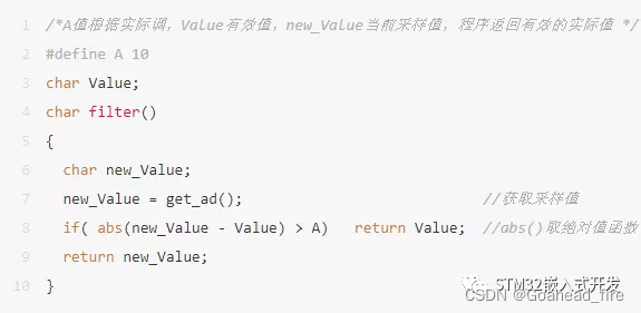 3 代码 char filter(){ char count,i,j; char Value_buf[N]; int sum=0; for(count=0;count<N;count++) Value_buf[count]= get_ad(); for(j=0;j<(N-1);j++) for(i=0;i<(N-j);i++) if(Value_buf>Value_buf[i+1]) { temp = Value_buf; Value_buf= Value_buf[i+1]; Value_buf[i+1]=temp; } for(count =1;count<N-1;count++) sum += Value_buf[count]; return (char)(sum/(N-2));}限幅平均滤波1 方法 2 优缺点 融合限幅、均值、队列的优点 消除脉冲干扰,占RAM较多