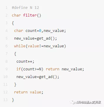 3 代码 #define A 10#define N 12char value;char filter(){ char new_value,count=0; new_value=get_ad(); while(value!=new_value) { if(Abs(value-new_value)<A) { count++; if(count>=N) return new_value; new_value=get_ad(); } return value; }}