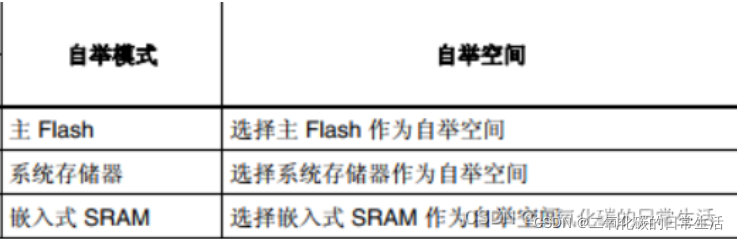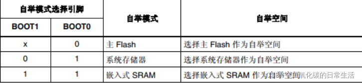 自举空间: 可以理解为单片机电源打开后,首先执行代码的地方。 主flash: 可以理解为程序运行中不进行运算的代码存储的地方。 系统存储器:此存储器中有厂家出厂就写好的代码,用户无法修改,该代码运行后可以用数据线进行下载程序。 嵌入式SRAM:可以理解为程序运行中要运算的代码存储的地方。 举个例子进行说明: int a=1;while(1){ a=a+1;}要知道单片机是靠一个个指令执行的,像while语句相比较与a=a+1是不需要运算的代码,所以保存在主flash中,而变化的a=a+1;以及定义语句int a=1;存储在RAM中,也就是变量以及运算的地方都在RAM进行,而之所以int a=1;也存储在RAM中,是因为int型的a会在RAM中占两个字节且初始值为1(0x 0000 0001),执行一次a=a+1后,a变成2(0x 0000 0010),道理显而易见。详细见FLASH与RAM在单片机中的作用。 三种模式讲解 ①BOOT1=任意电平,BOOT0=0 ②BOOT1=0,BOOT0=1 ③BOOT1=1,BOOT0=1。 首先要明白,不同的启动方式会影响到程序的下载方式。 第一种模式,就只能选择常见的STLINK,JTAK进行程序的烧录。按下复位键就可以运行自己写的程序,不需要改变启动方式。 第二种模式,只能选择数据线下载,下载完成后,需要手动调到第一种模式,复位后才会运行自己写的程序。其实这种操作就相当于给刚买的电脑装系统,电脑自带一个最原始的系统帮助用户安装新系统。总之十分麻烦而且下载速度非常慢。 第三种模式,方便调试,怎么个方便法,在收集了大量资料后发现并没什么用。