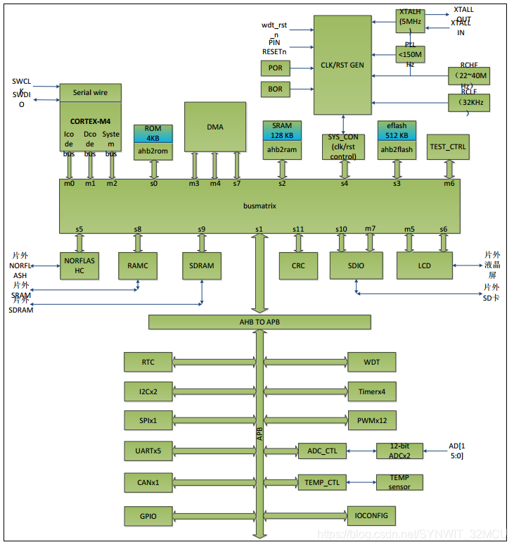 前面了解到,每个单片机实质是一个片上系统,这里我们看看SWM320的片上系统结构框图,具体如图1-1所示。