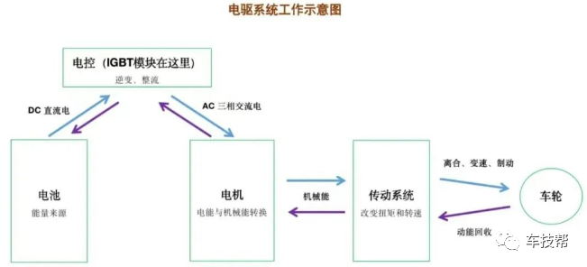 要了解IGBT模块,就要先了解新能源汽车的电驱系统,先用一句话概括电驱系统如何工作:在驾驶新能源汽车时,电机控制器把动力电池放出的直流电(DC)变为交流电(AC)(这个过程即逆变),让驱动电机工作,电机将电能转换成机械能,再通过传动系统(主要是减速器)让汽车的轮子跑起来。反过来,把车轮的机械能转换存储到电池的过程就是动能回收。
