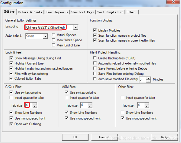 在该对话框中,先设置 Encoding 为:Chinese GB2312(Simplified),然后设置 Tab size 为:4。