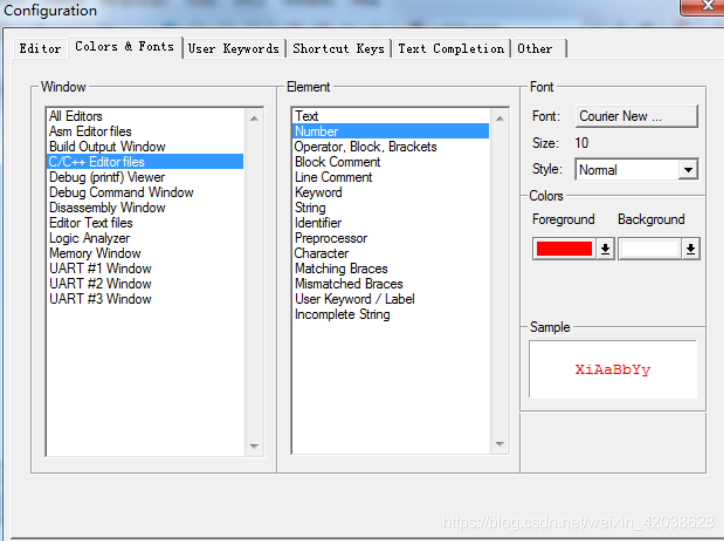 在右边就可以看到相应的元素了。然后点击各个元素修改为你喜欢的颜色(注意双击,且有时候可能需要设置多次才生效,MDK 的 bug),当然也可以在 Font 栏设置你字体的类型,以及字体的大小等。设置成之后,点击 OK,就可以在主界面看到你所修改后的结果,