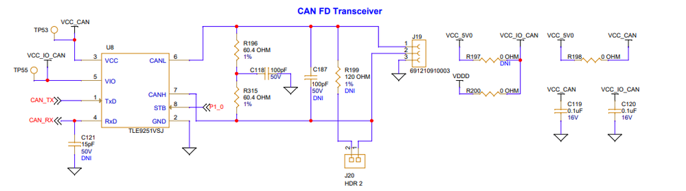 4.问题分析: 4.1查看KIT_XMC72_EVK XMC7200 evaluation kit原理图中 CAN硬件模块的设计,截图如下。分析问题可能出在XMC7200 controller或者TLE9251VSJ Transceiver。分析数据1Mbps和2Mbps都能正常通信,超过3.6Mbps以上就出现error,判断可能和回读的偏差有关系。