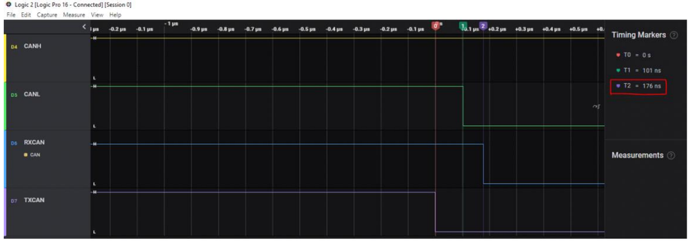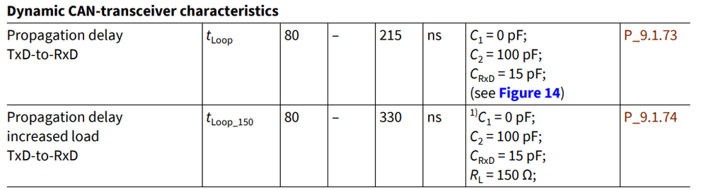 我们知道CAN控制器会将收发器RX pin 的数据采样接收,用于判断TX pin 的数据是否被成功发送,以便实现仲裁判断和错误处理。从数据手册看TxD-to-RxD 的最大延迟是215ns,数值与 5Mbps传输速率的 bit 传输时间 (200ns) 相当,所以该延迟会导致回读错位。 经过实测,板级的延迟 为176ns。
