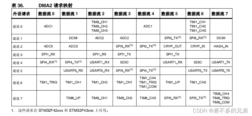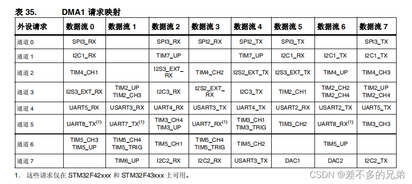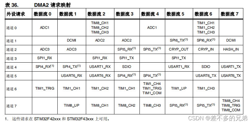 o 可编程的数据传输数目:最大为65535。 3.DMA映射表以stm32F4系列为例