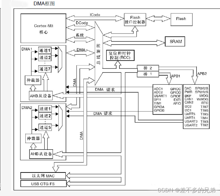 o 闪存、SRAM、外设的SRAM、APB1、APB2和AHB外设均可作为访问的源和目标;