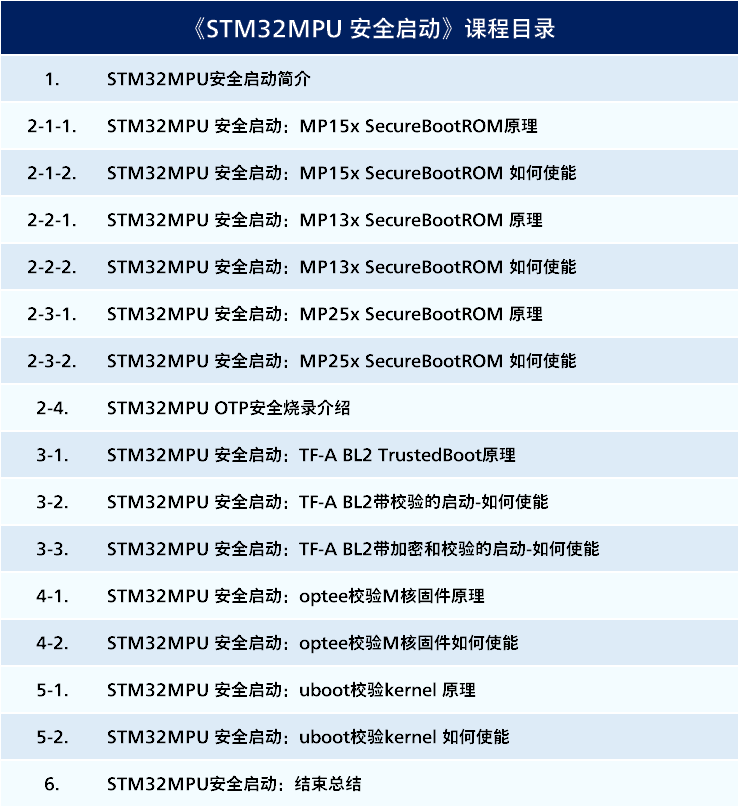 需要注意的是,并非所有的STM32MP1和STM32MP2型号都默认支持安全启动。支持安全启动的STM32MPU产品型号上通常会带有“C”或“F”字符。如果您希望使用安全启动功能,在选择产品是需要特别关注一下型号,如STM32MP15xC或STM32MP15xF型号,或STM32MP25xC或STM32MP25xF型号,以便在实践中体验STM32MPU安全启动机制。 2课程大纲及目录