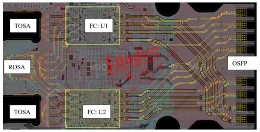 高速先生成员--周伟 关于光模块的仿真,从10GE到1.6TE的光模块其实我们都有仿过,很多客户一开始的需求都是希望能看下眼图,但经过我们解释后,最后还是同意按照协议进行无源仿真,今天我们就来聊聊为什么只仿真无源而不去仿真有源看眼图的方式吧。 如下是我们其中一个1.6T光模块的部分设计线路图,这些高速信号的线路又被分成了两部分:一部分是从OSFP金手指到中间的DSP芯片,分别由8对TX和8对RX组成,每对200/224Gbps的速率构成了收发1.6TE的通道;另一部分就是从芯片到TOSA和ROSA接口焊盘,也是由8对TX和8对RX构成,每对也是200/224Gbps的速率。金手指到DSP芯片部分是有协议损耗要求的,而后一部分协议上没有定义相关的电气要求。
