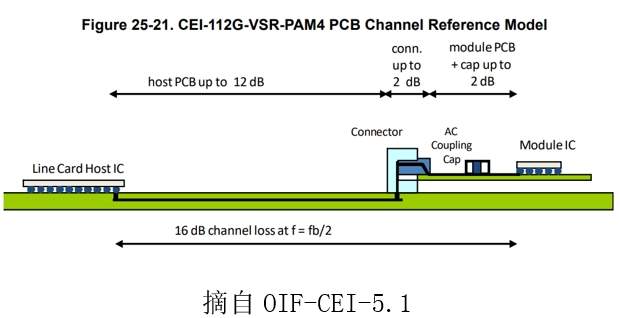 这时候可能就有人要问了,设计难度可以理解,那这种1.6T光模块的仿真有什么难点呢? 其实相对于仿真来说,设计是简单的,设计只要保证连通性就好了,简单来说就是只要能顺利把线走出来就成功了一半,难的是除了线走出来,还要能保证信号质量,这个就必须通过仿真来保障了。前面说了1.6TE光模块的信号速率最高是224Gbps,当然是PAM4编码的,那么它的基频就到了56GHz了,频率越高,仿真难度就越大,后面的线损也很大,一点点差异都会影响到最终的性能,如材料的选择,不同层的出线和过孔优化方式等;普通的通孔设计在频率不是太高的时候过孔特性差异不是很大,但到了30GHz甚至50GHz以后,再叠加任意阶HDI的过孔,不同层的过孔就需要单独进行仿真,还有金手指处的焊盘也需要特殊优化,我们会加上连接器的3D模型来模拟真实插上连接器时的特性,这样和实际情况更接近,仿真也更准确;所有的这些操作带来的后果就是工作量变大,需要的仿真时间更多了。 那为什么光模块的仿真很多只仿真无源而很少仿真有源眼图和误码率呢?这确实是很多人关心的话题。首先我们来看看光模块VSR协议的无源要求吧,如下图是OIF-CEI-5.1协议上摘抄的关于112G-VSR-PAM4对于PCB通道的参考模型及损耗要求。