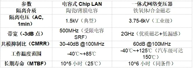 vs 一体式网络变压器 —— 高频性能与可靠性突破1. 电感式Chip LAN的技术革新