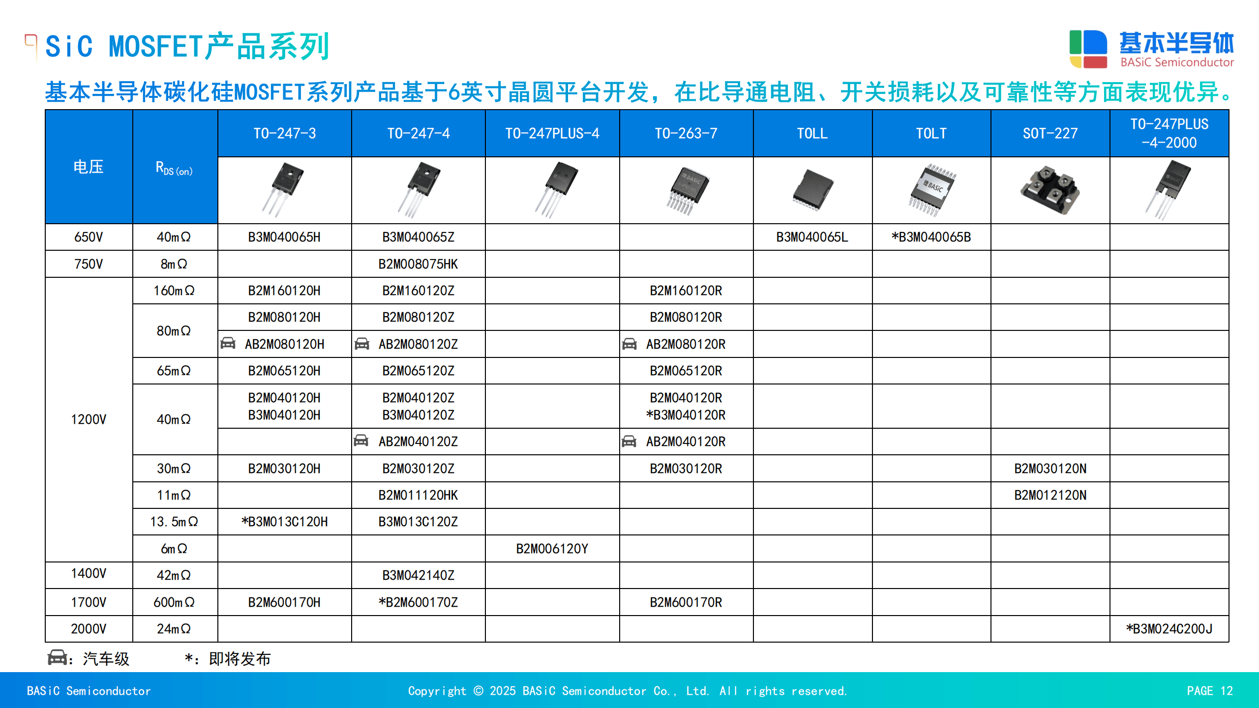 基本半导体针对不同功率等级和应用需求,构建了完整且梯度清晰的SiC功率半导体产品矩阵。该产品线主要由BMF系列SiC MOSFET模块和B3M系列SiC分立器件构成,提供了从分立式封装到高功率模块的全面解决方案。