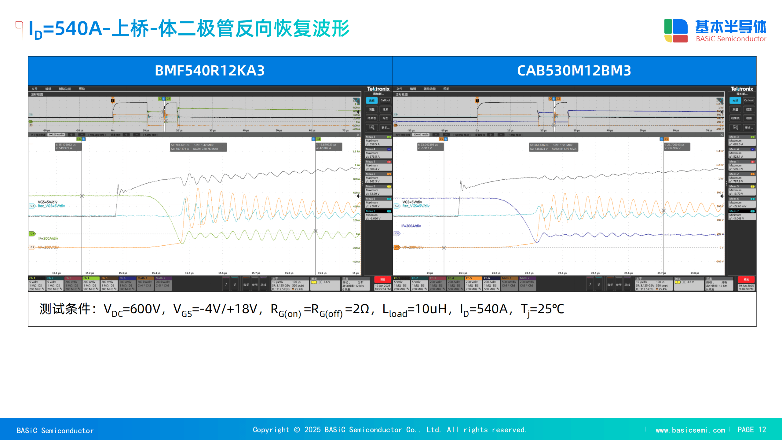 反向恢复特性:在反向恢复电荷$Q_{rr}和反向恢复电流峰值I_{rrm}$等关键参数上,BMF540R12KA3与竞品性能相当,均表现出SiC体二极管固有的快速恢复特性 。