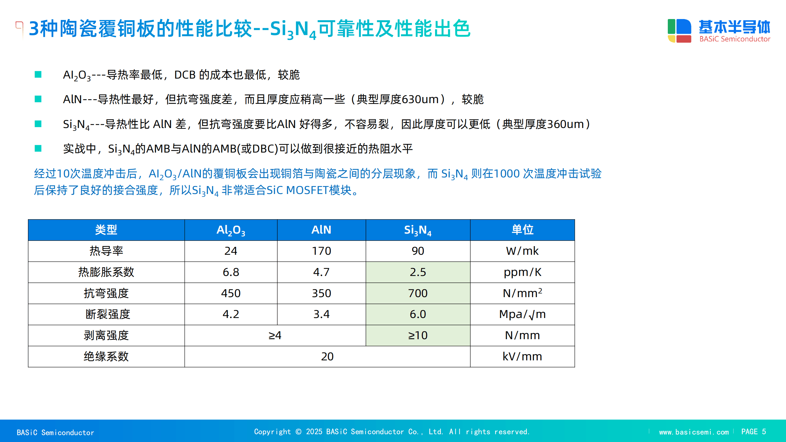 尽管Si3N4的热导率(90 W/mk)低于AlN(170 W/mk),但其卓越的机械强度和热循环寿命使其成为SiC MOSFET模块的理想选择 。在诸如新能源电驱、大功率工业电源等高功率密度的恶劣工作环境中,模块会经历剧烈的温度变化。选择