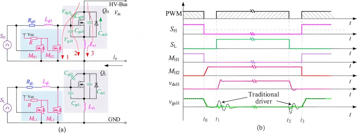 米勒效应是高频SiC应用中一个必须解决的关键工程挑战。在半桥电路中,当下管处于关断状态时,其门极-源极电压(VGS)通过门极-漏极寄生电容(Cgd)与上管的漏极-源极电压(VDS)耦合。当上管开通,桥臂中点电压迅速上升时,这个高dv/dt会通过$C_{gd}$产生一个米勒电流(Igd) 。这个米勒电流流过下管门极回路的关断电阻,会在其门极产生一个正向电压尖峰。如果这个尖峰电压超过下管的门槛电压(VGS(th)),就会导致下管误导通,从而引发上下管同时导通的“桥臂直通”现象,造成灾难性损坏 。由于SiC MOSFET的门槛电压通常较低(如2.7V),且其开关速度( dv/dt)远高于Si IGBT,这使得SiC器件的米勒效应问题远比Si器件严重,必须从系统层面解决。