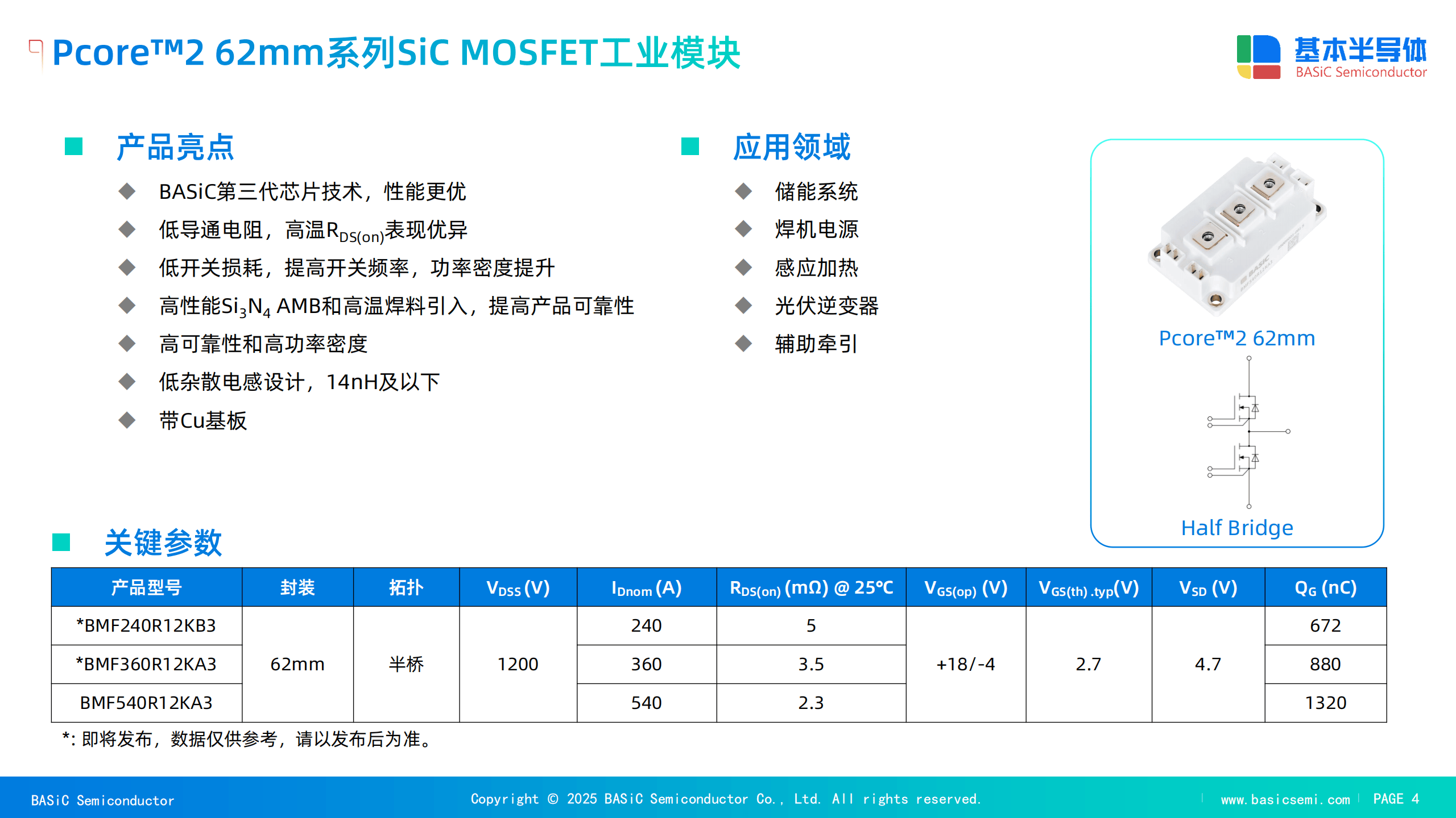 封装是SiC模块性能的“最后一公里”。高功率应用中的热应力和机械应力对模块的长期可靠性至关重要。基本半导体在其62mm模块(如BMF360R12KA3和BMF540R12KA3)中采用了先进的Pcore™2 62mm封装技术,其核心在于高性能的Si3N4陶瓷基板和铜基板的应用 。