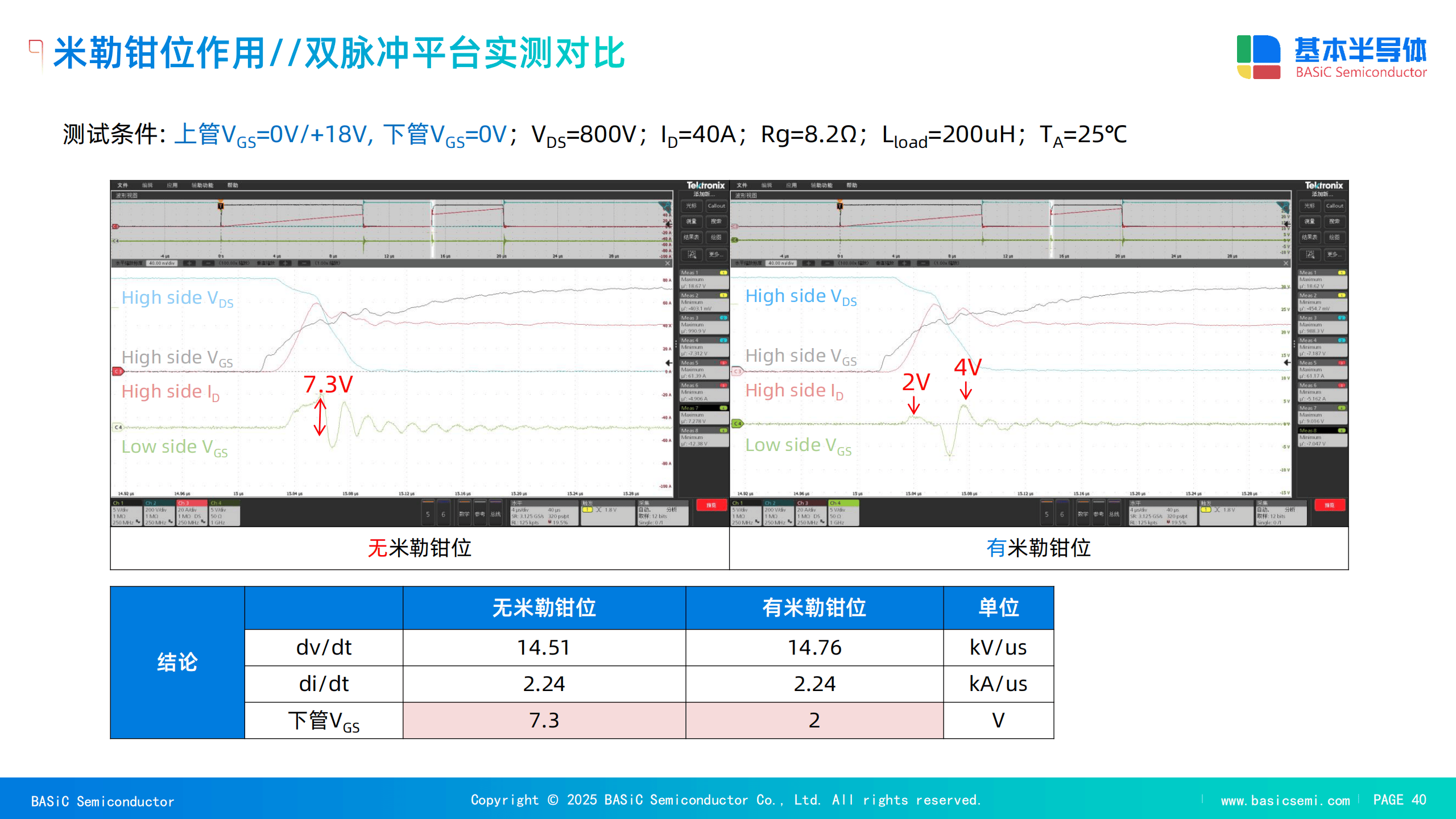 文档提供的仿真波形数据直观地验证了该功能的有效性。在“无米勒钳位”条件下,下管的门极电压尖峰被抬高至7.3V,而在“有米勒钳位”时,该尖峰被有效抑制至2V 。这种显著的差异为BTD5452R功能的有效性提供了直接证据,证明了有源米勒钳位是利用SiC优势、同时保障系统可靠性的必要功能。