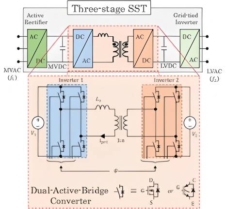 SST应用:SST方案的核心优势在于可控性高和体积小。其通过三级电路拓扑实现电能转换和隔离,其中隔离级的高频DC-DC变换是关键。SiC MOSFET的高频开关能力(如BMF系列模块)使得变压器的工作频率可以从传统的工频(50/60Hz)提升至20kHz-100kHz,从而将变压器体积缩小至传统变压器的1/10,并实现高于98%的隔离级效率,这是SST方案的核心优势 。
