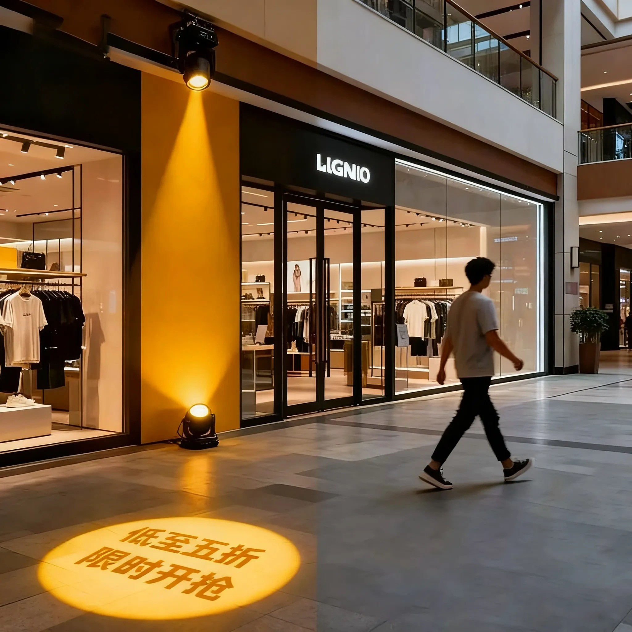 投影射灯的工作原理并不复杂:电源驱动LED发光,经高清透镜聚光,穿过蚀刻了图案的广告片,再通过透镜调节焦距,最终将清晰的图案投射到墙体或地面。这套成熟的光学系统支撑了投影灯在广告领域的快速普及。