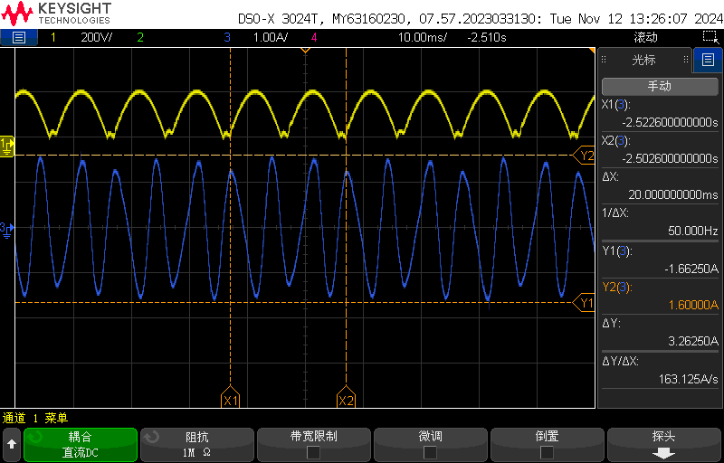 关键性能参数AC:176V,4500rpm下的波形:黄色为母线电压,蓝色为电机电流。