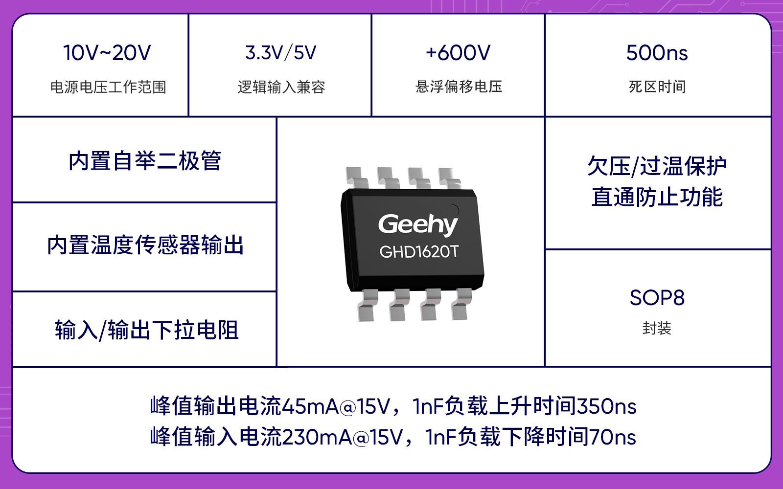 - 内置500ns死区时间,支持欠压/过温保护、直通防止功能,可有效保护功率器件稳定运行;