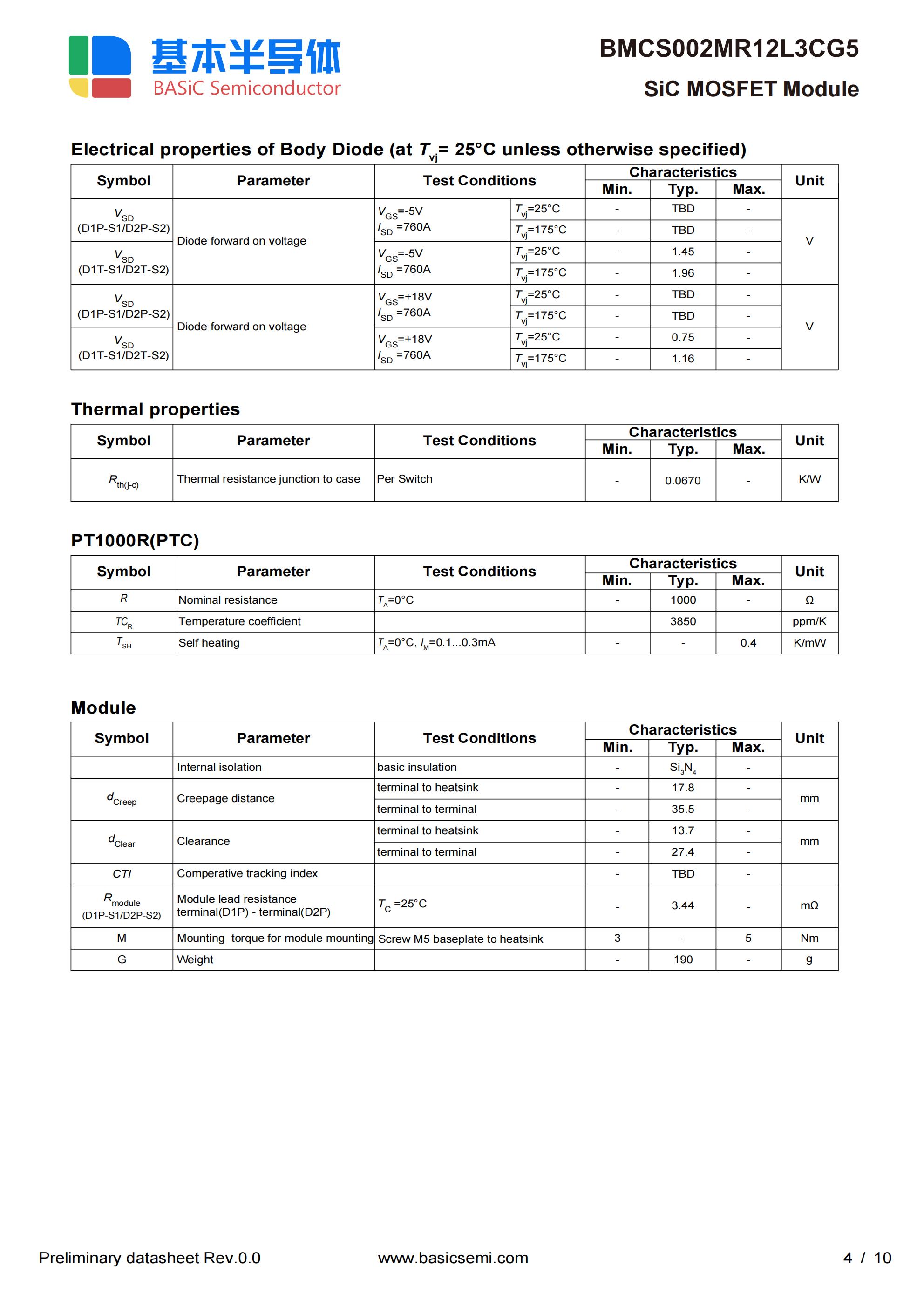 其结壳热阻(Per Switch)低至 0.0670 K/W 。SSCB在正常运行时承载数百安培电流,其导通损耗产生的热量必须被高效导出。如此低的热阻是实现760 A额定电流的关键,它确保了SiC芯片产生的热量(见1.2节分析)能迅速传递到散热器,使结温保持在安全的操作范围内($T_{vjop}$ 150°C, $T_{vj}$ 175°C max) 。