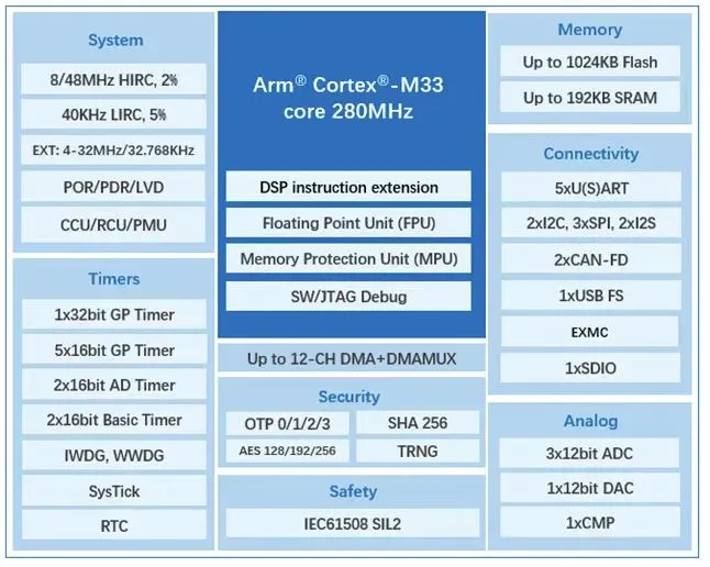 GD32F503/505系列芯片采用Arm® Cortex®-M33高性能内核,GD32F505主频280MHz,GD32F503主频252MHz,依托高效的Arm®v8-M架构,内置高级DSP硬件加速器和单精度浮点单元(FPU)。GD32F503/505系列芯片可提供高达4.10 CoreMark/MHz和1.51 DMIPS/MHz的卓越性能。