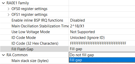 目前,RA0E1为了优化代码大小,默认使用“Fill gap”和“Optimize aggressively for size (-Oz)”。 参考FSP手册中的内容,在 vector table 的末尾 (靠近 flash 的开头) 和 ROM 寄存器 (地址 0x400) 之间存在一段代码 flash。当“Fill Flash Gap”选项选择 “Fill gap”时,会将预先选择的设置函数填充在此区域内,以减少 FSP 使用的代码 flash 量。 所以,当用户将优化选项改为 “None (-O0)”,将会导致该函数编译出来的内容占据较大的Flash空间,会超出gap区域,导致出现编译错误。 为避免这种情况,用户可以通过在 BSP 属性中将“Fill Flash Gap”设置更改为“Do not fill gap”来禁用间隙填充。