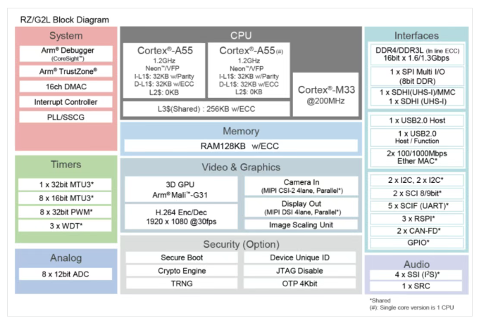 RZ/G2L微处理器配备Cortex®-A55 (1.2 GHz) CPU、16位DDR3L/DDR4接口、带Arm Mali-G31的3D图形加速引擎以及视频编解码器(H.264)。此外,这款微处理器还配备有大量接口,如摄像头输入、显示输出、USB 2.0和千兆以太网,因此特别适用于入门级工业人机界面(HMI)和具有视频功能的嵌入式设备等应用。