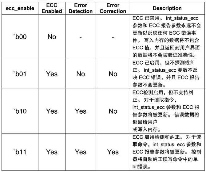 控制器中的ECC功能由ecc_enable参数控制。该参数使能ECC,并设置上报和纠错行为。