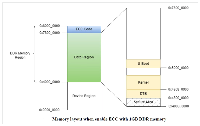 G2L内存控制器支持in-line ECC,其中内存区域的一部分(1/8)用于ECC存储。当ECC功能启用时,内存控制器将分配顶部1/8内存区域来存储ECC校验码。并且不允许用户访问该区域。