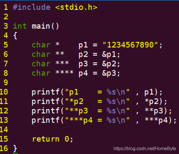 pa是一个整型指针变量,指向的地址是整型变量a的地址,而*pa是地址里面的内容,也就是变量a的值100。 由此看一个程序:   char *类型指针p1,指向常量区内容为"1234567890"的地址; char **指向指针的指针p2,指向p1地址,因此*p2就是p1,依次类推 定义char ***p3存放p2地址,*p3就是p2,**p3相当于*p2也就是p1; 定义char ****p4存放p3地址,*p4就是p3,**p4相当于*p3也就是p2, ***p4相当于**p3也就是*p2即p1。 上述程序中printf的输出应该都是一样的,编译测试:   1.8 通用类型指针a. 类型转换。