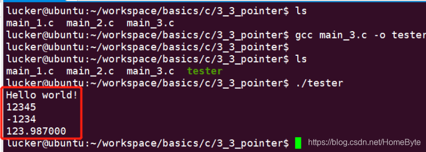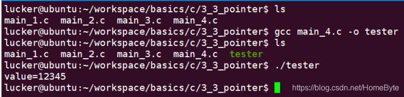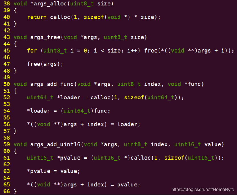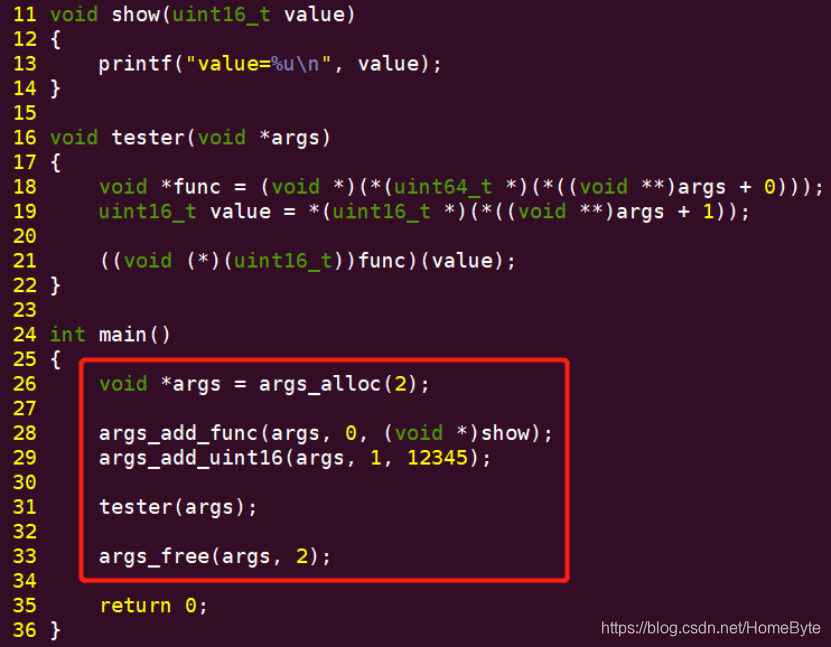 下面这个例子会比较抽象(涉及到指针和地址比较抽象的转换关系,了解即可,不要求能理解里面的转换逻辑),源码放在main_4.c中,需要很好理解地址和指针变量的关系,我们借助void *的列表来存储一段空间,并用来做回调函数的调用,从而达到代理调用的过程。 思考一下:int *pa = (int *)malloc(sizeof(int)); 这个代码中,指针变量本身的地址在哪,指针变量指向的地址在哪,指针变量指向的地址里面的内容是什么,先清这几个概念再继续往下看,首先指针变量本身的地址是&pa;指针指向的地址是pa(准确来说是(uint64_t)pa);指针指向的地址里面的内容是*pa。 声明几个函数如下:   然后有一定测试代码如下:   首先我们申请了2个参数(args),然后给两个参数进行赋值,第一个值是一个函数的地址,第二个值是一个uint16_t类型的数值(12345);然后调用tester进行测试,函数tester里面把args的内容(函数和数值)取出来,进行调用,也就是把第一值强制转换成函数指针(第21行),然后传入数值完成调用。 再看args这几个声明的函数实现:   在函数args_add_func里面,首先我们把指针变量func所指向的地址保存了起来(loader),然后loader被放在args中,由于index是0,因此是放在第一个位置;在函数args_add_uint16里面,我们则是把变量value的数值保存起来(pvalue),然后放在args第二个位置(index是1)。再回过头看tester里面的代码大概就能看懂了。 编译运行,结果等价于直接调用show函数:show(12345):   1.9 主函数(main)参数列表默认情况下,main函数是一个程序的入口函数,而我们可以给程序传入一系列的参数列表,这个列表可以在main函数中被解析;这就需要main函数是带参的方式使用了,基本写法:int main(int argc, char *argv[])。 main函数参数列表的解析,需要包含一个头文件:#include <getopt.h>,利用该头文件提供的接口,我们需要理解几个地方即可, a. 结构体: