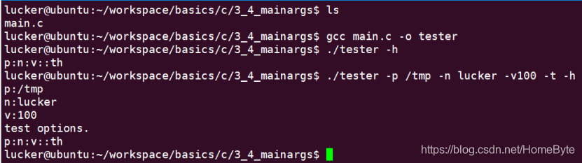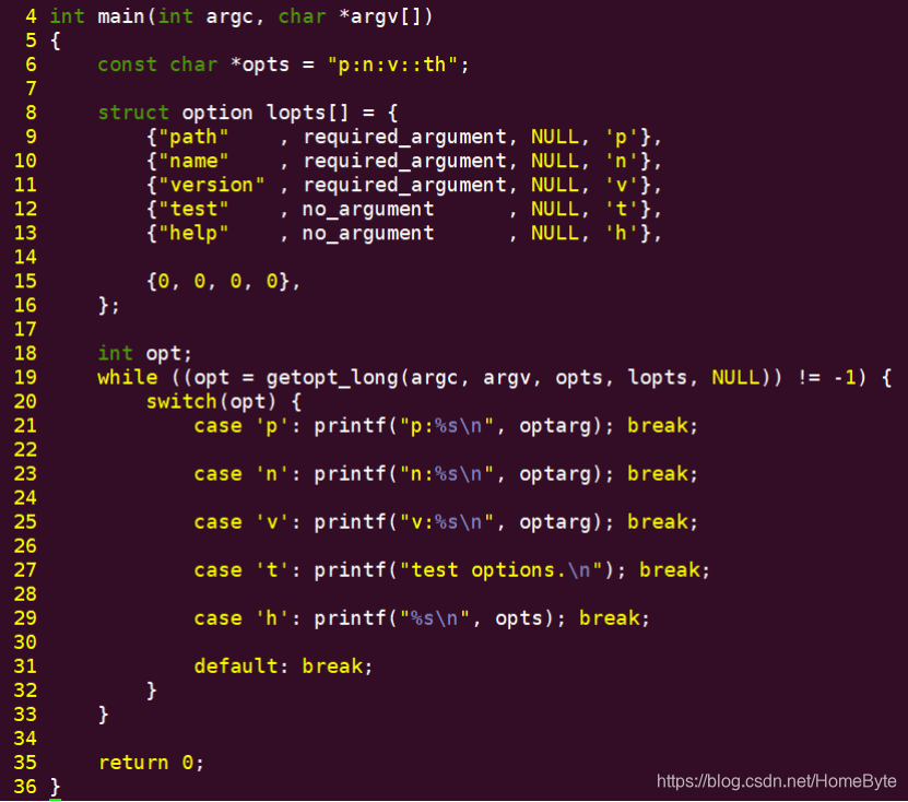 const char *name; // 选项(参数)名 int has_arg; // 是否选项后有参数,常用取值如下: // required_argument,no_argument int *flag; // NULL时返回val,使用时保持NULL就可以了。 int val; // 返回值,需和flag配合。 }; b. 外部变量: extern char *optarg; // 当前选项对应的参数值。 c. 函数(结合例子看): int getopt_long(int argc, char * const argv[], const char *optstring, const struct option *longopts, int *longindex); d. 还有就是选项字符串: