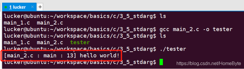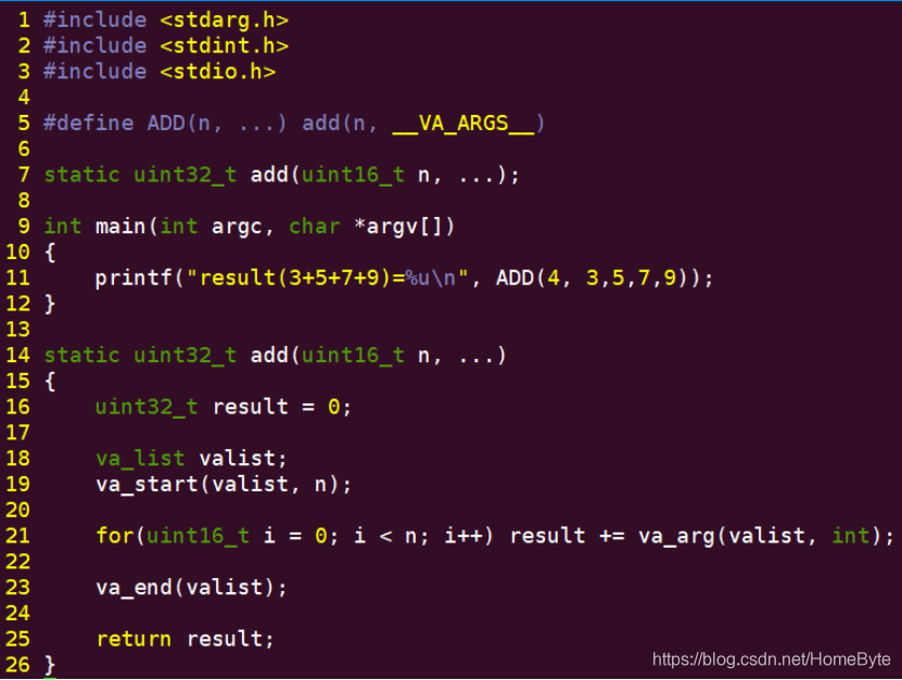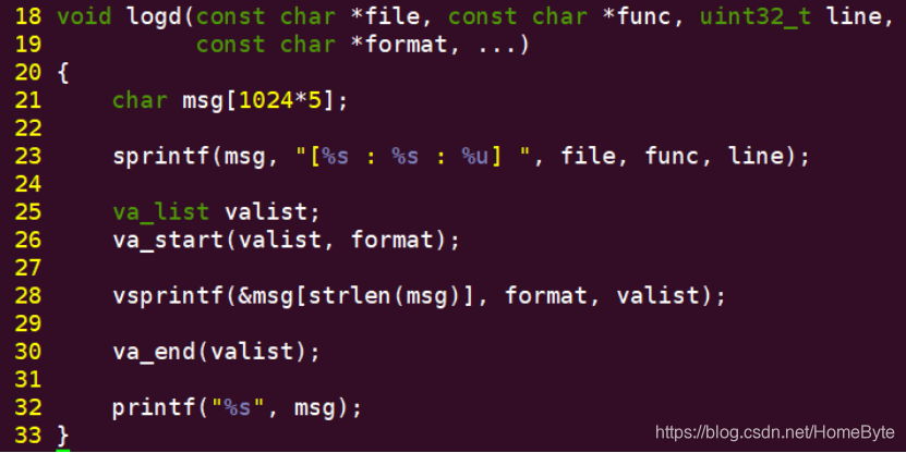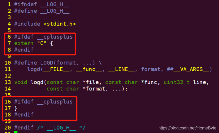 例子(模板),选项必须再opts中找得到:   编译运行如下:   1.10 可变参数基本用法C语言的可变参数解析需要包含头文件:#include <stdarg.h>,直接上例子,我们实现一个加法函数add,用来求和:   add第一个参数n,表示可变参数的长度,有几个地方说明下: va_list 为可变参数类型。 va_start 是一个宏,计算起始地址。 va_end 是一个宏,计算结束地址。 va_arg 是一个宏,它返回当前取值指针指向的参数值并将取值指针指向形参列表的下一个参数的首地址。 结果如上图,基本是固定的,我们通过va_arg拿出可变参数的每个数据,然后进行加法运算。 main函数中调用的不是函数add,而是宏ADD,这里主要是说明宏如何进行可变参数的处理,可以用__VA_ARGS__来表示可变参数。 编译运行:   1.10.1 扩展用法之日志输出利用可变参数的特性,我们可以实现一个日志功能,输出带有文件名,函数名,行号的一个接口来代替printf的功能;再linux c中,可以用三个宏来分别表示文件名:__FILE__;函数名:__func__;行号:__LINE__;有了这三个宏,我们再把用户输出的内容拼接进入,就可以完成一个带格式的日志功能了,首先声明并实现一个函数logd如下:   这个函数的参数列表包括:文件名file,函数名func,行号line,剩下的format和一个可变参数;可变参数的解析结构和上节课一样,多出一个新的接口函数是vsprintf,这个接口是把可变参数的内容格式化为一个字符串。 为了简化调用,我们定义一个宏LOG,这个宏主要的作用是自己填充文件名,函数名,行号,简化调用过程:   最后是使用的方法:   编译运行:   1.11 头文件兼容C++定义.h文件时,可以按照下面的声明方式,从而完成对c++的兼容:   头文件应符合几个基本要求: - 尽可能少的包含其他头文件。