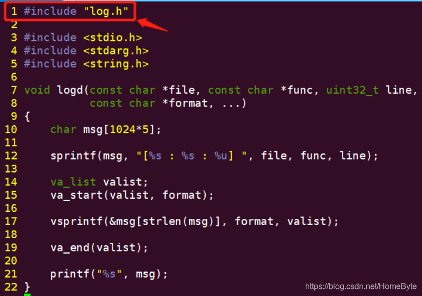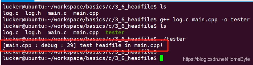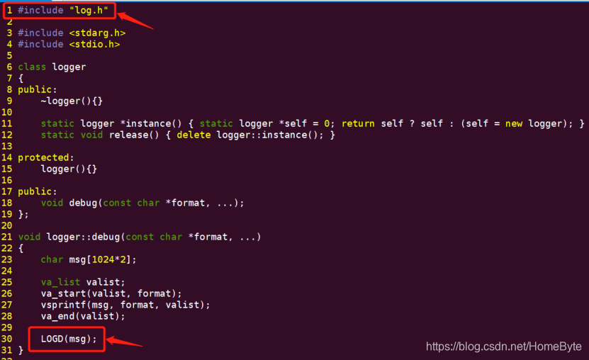 1.11.2 日志功能实例我们把3.5.2中的日志接口单独抽取出来,放在log.h中去声明接口函数,然后在log.c中去实现,最后在main.c中去包括log.h并通过宏来调用日志输出功能。 接口实现源码log.c如下:   然后main.c中的调用如下:   编译运行(gcc log.c main.c -o tester):   1.11.3 C++源文件测试上一节C语言测试了log.h,现在我们创建一个main.cpp,在C++源码中来测试,测试内容如下(嵌入式C++基础后续在基础篇中加入,这里了解即可):   logger::instance()是为了取得一个类logger的单例,类logger中有一个函数debug对log.h中的接口进行了一次封装;调用如下:   编译运行(g++ log.c main.cpp -o tester):