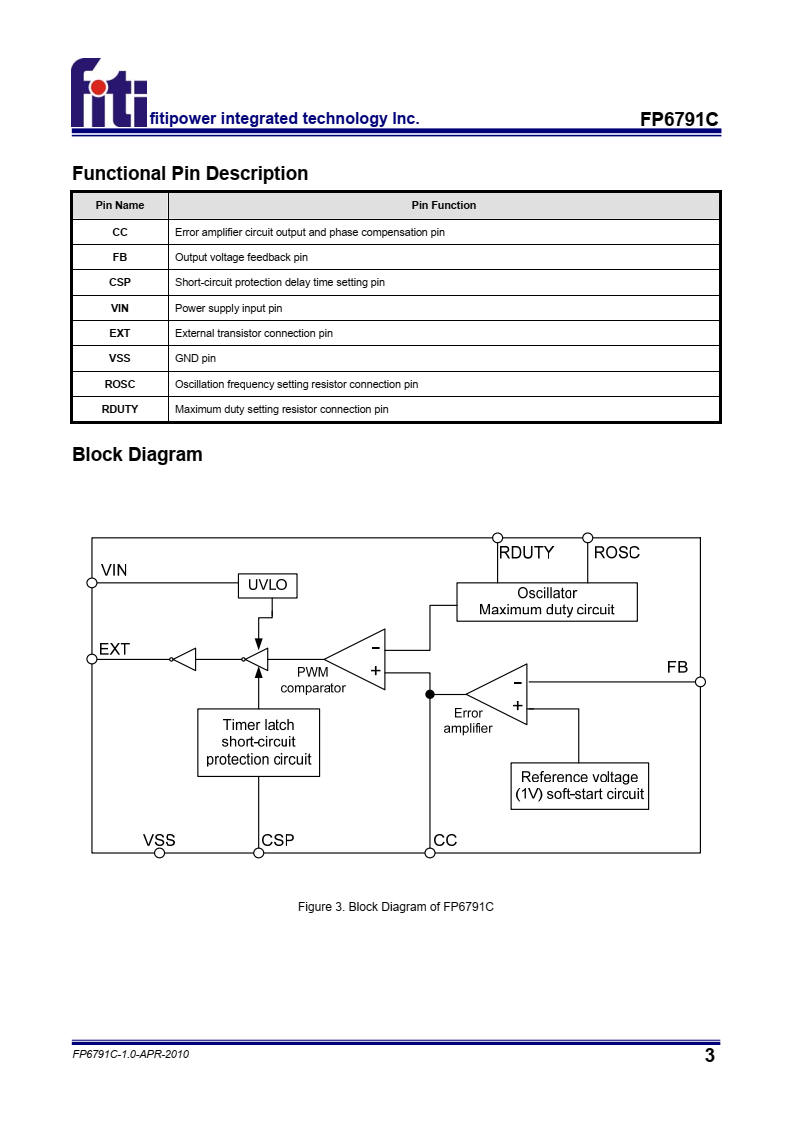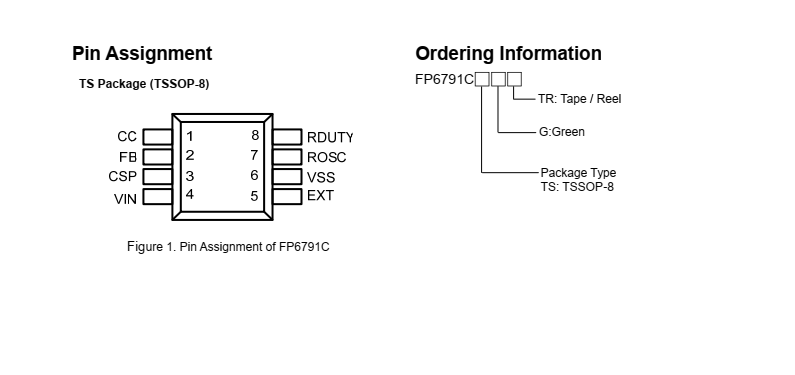 In addition, the FP6791C provides adjustable shortcircuit protection delay time with an external capacitor connected to the CSP pin. If the maximum duty condition continues because of short-circuiting, the capacitor externally connected to the CSP pin is charged, and oscillation stops after a specific time. This condition is cleared by re-application of power. This controller IC allows various settings and employs a small package, making it very easy to use.
